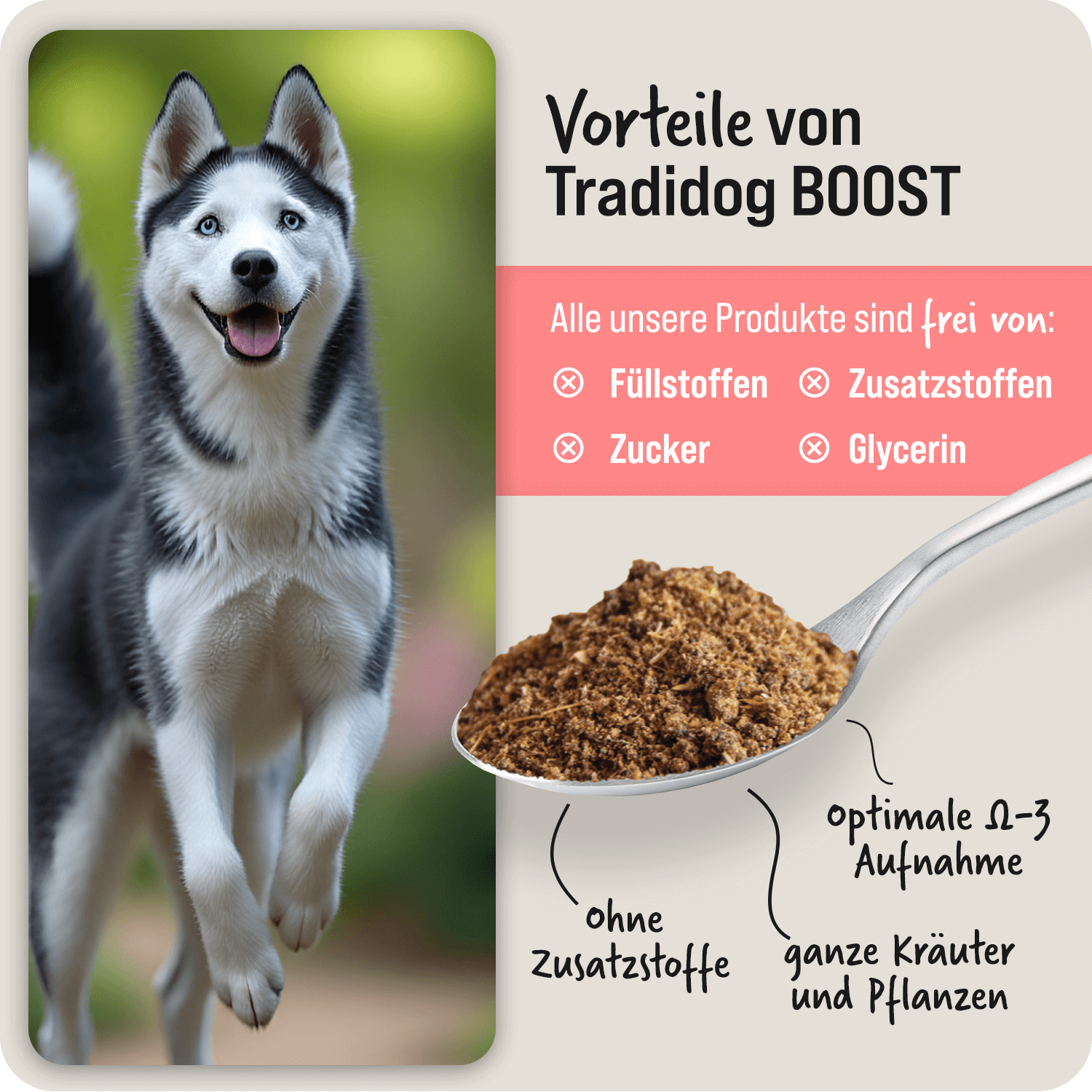 Most commercially available foods contain a maximum of 2g of omega-3 per daily portion, which is only about 50% of the recommended daily intake for medium-sized dogs. Tradidog's food topping, on the other hand, provides 2.46g of omega-3 per portion – optimally covering this requirement. This way, your dog is provided with a targeted supply of high-quality omega-3 fatty acids! Learn more
