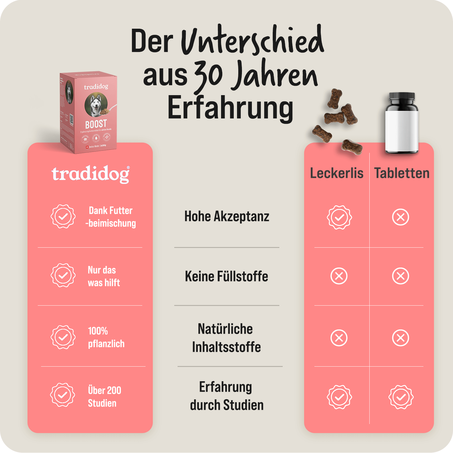 At Tradidog, your dog is our focus – every day, in every decision. We produce everything ourselves and exclusively in Switzerland, with the care and precision you expect from Swiss quality. Our ingredients are purely natural, come from controlled cultivation, and are processed in a way that preserves their full plant potency. Because we believe that what truly helps your dog comes from nature – and from genuine responsibility.