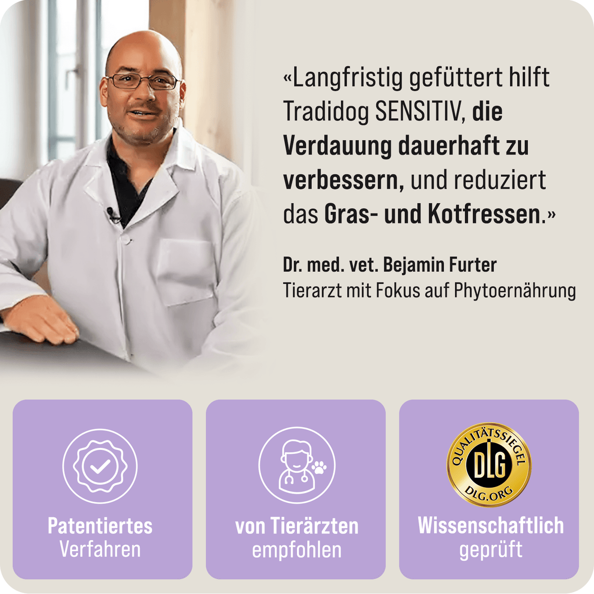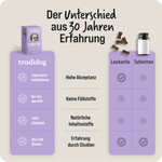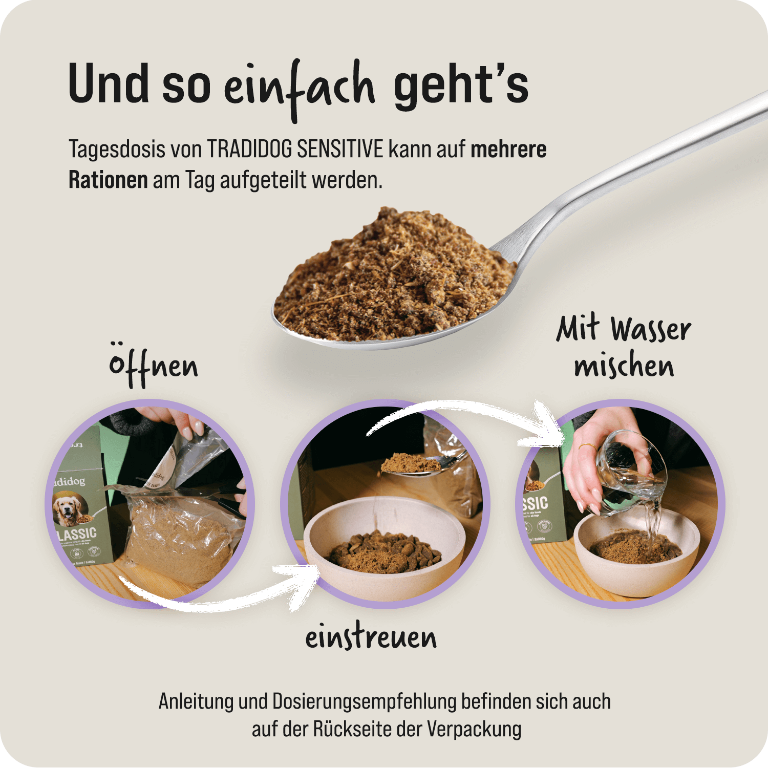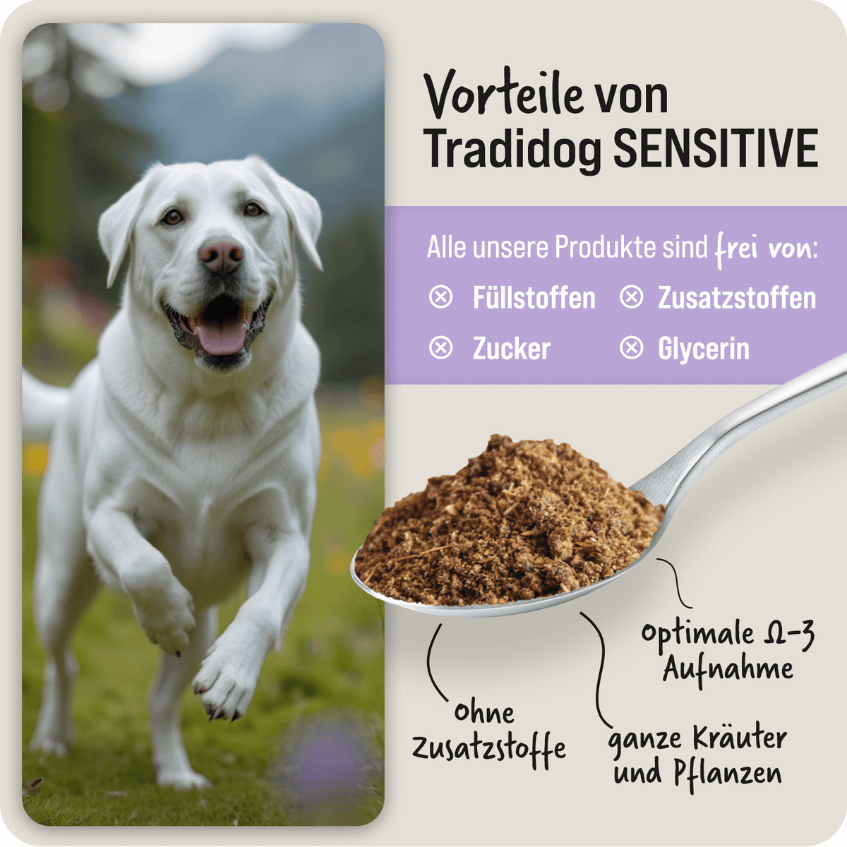 Most commercially available foods contain a maximum of 2g of omega-3 per daily portion, which is only about 50% of the recommended daily intake for medium-sized dogs. Tradidog's food topping, on the other hand, provides 2.46g of omega-3 per portion – optimally covering this requirement. This way, your dog is provided with a targeted supply of high-quality omega-3 fatty acids! Learn more