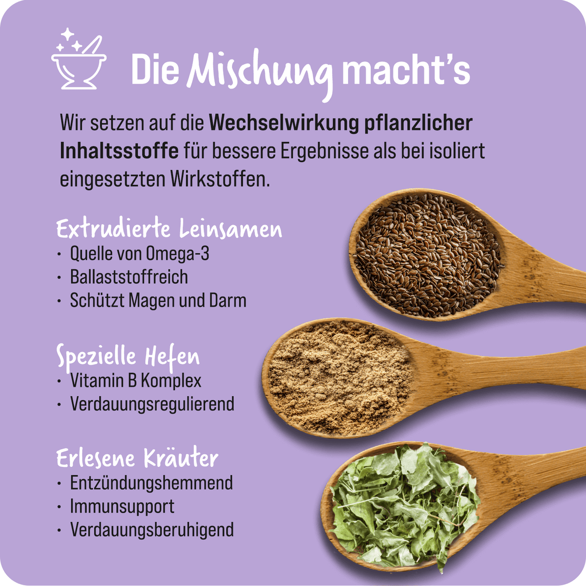 Fiber, mucilage, and bacteria soothe irritated mucous membranes, promote enzyme production, and balance the intestinal flora—for less flatulence, softer stools, and a good gut feeling.