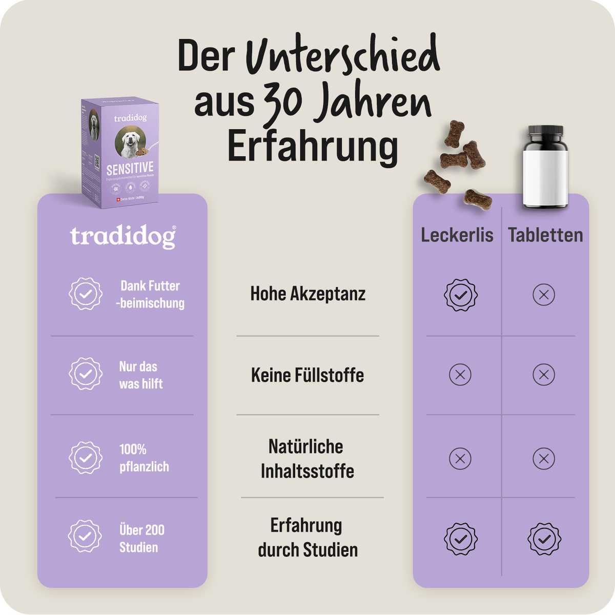 At Tradidog, your dog is our focus – every day, in every decision. We produce everything ourselves and exclusively in Switzerland, with the care and precision you expect from Swiss quality. Our ingredients are purely natural, come from controlled cultivation, and are processed in a way that preserves their full plant potency. Because we believe that what truly helps your dog comes from nature – and from genuine responsibility.