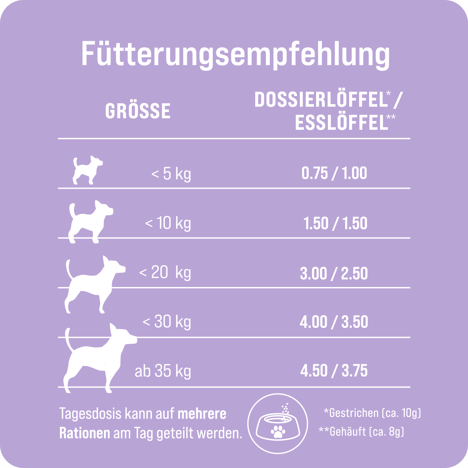 This 100% natural food topping is a specially developed nutritional supplement for sensitive dogs. It supports digestion, skin, and the immune system – especially in cases of intolerances or inflammation.
