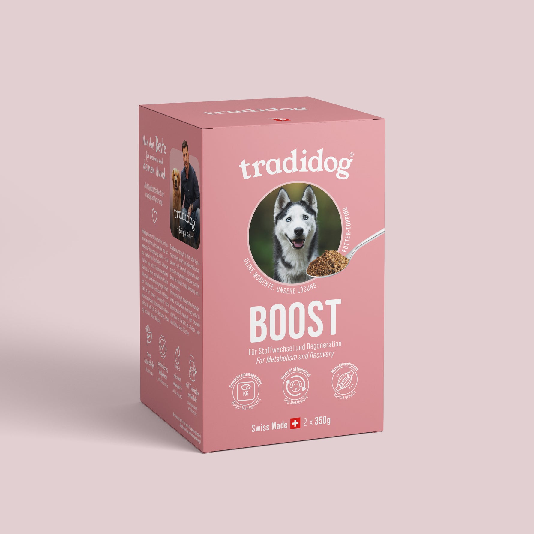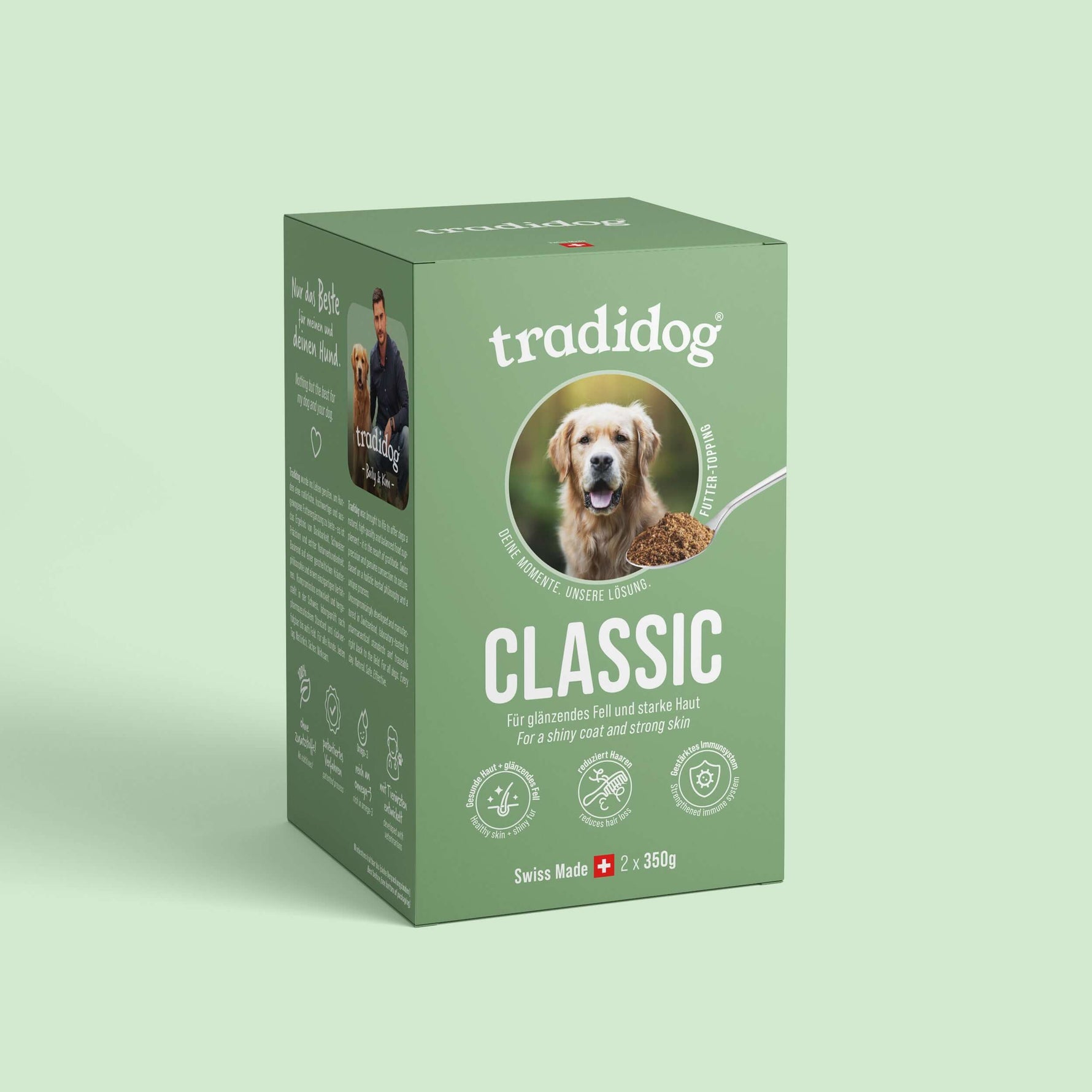Tradidog is a 100% natural food topping from Switzerland โ€“ developed for more health, shine, and zest for life in your dog.