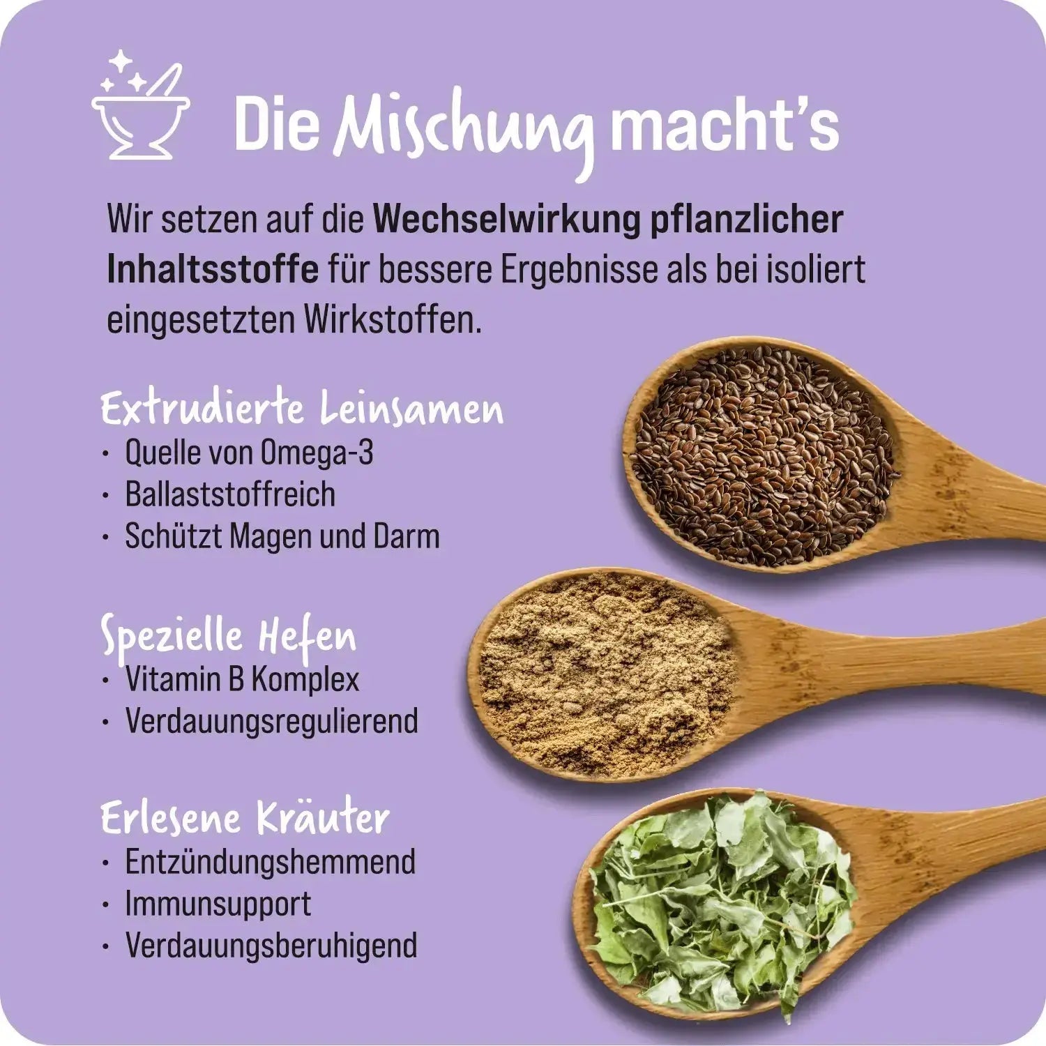 Die enthaltenen Pflanzenstoffe und Enzymaktivatoren verbessern die Verwertung des Futters – für mehr Energie aus jedem Bissen und weniger Belastung für den Verdauungstrakt.