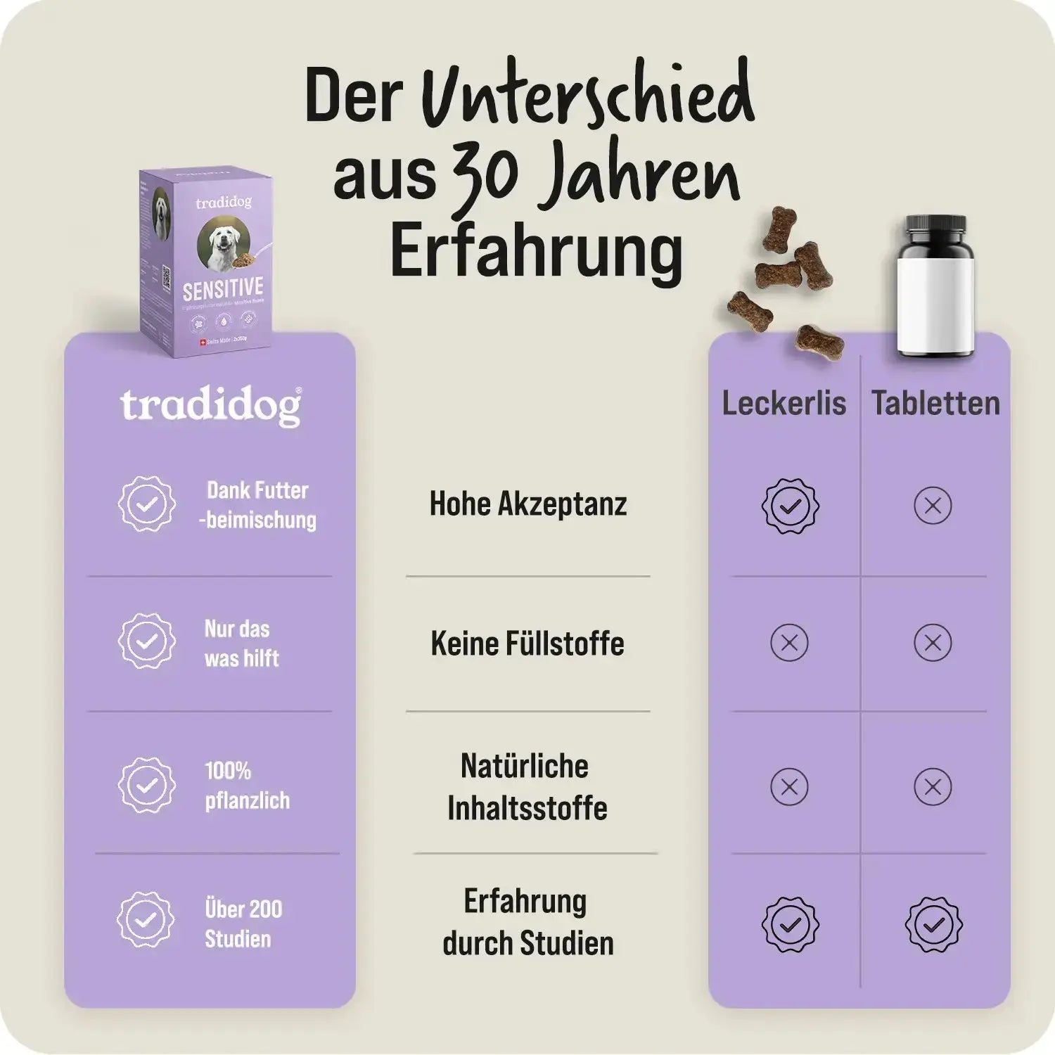 Chez Tradidog, ton chien est au centre de nos préoccupations - chaque jour, à chaque décision. Nous produisons tout nous-mêmes et exclusivement en Suisse, avec le soin et la précision que tu es en droit d'attendre de la qualité suisse. Nos ingrédients sont purement naturels, proviennent de cultures contrôlées et sont transformés de manière à conserver toute leur puissance végétale. Car nous pensons que ce qui aide vraiment ton chien vient de la nature - et d'une véritable responsabilité.